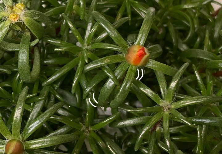 채송화(菜松花)는 우리에게 익숙한 넓은 잎의 식물과 달리 뾰족한 잎을 가지고 있어요. 잎 모양이 소나무 잎을 닮아 이름에 ‘소나무 송(松)’이 쓰인 것이지요. 뾰족한 잎을 가졌지만 잎과 줄기에 수분이 많이 함유된 다육식물이기 때문에 만져도 전혀 따갑지 않아요. 덕분에 건조한 환경에서도 잘 견디는 식물이랍니다.